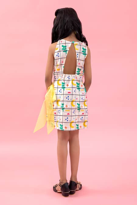 Off-white dress featuring geometric print all over with wrap detailing in the front and cut-out detailing on the back