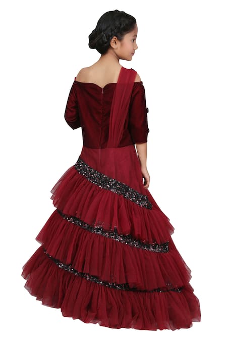 Buy_Kirti Agarwal - Pret N Couture_Maroon Net Sequins, Fabric Flowers Layered Gown With Attached Dupatta_at_Aza_Fashions