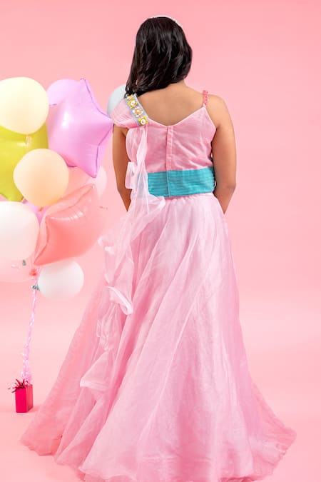 Pink organza flared lehenga featuring a scalloped hem. Paired with a pleated blouse adorned with floral bead embroidery.