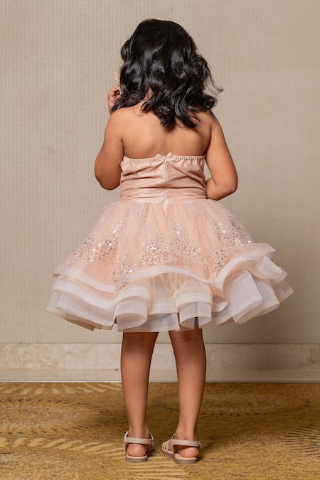Beige layered frock featuring sequin and beads embroidery in a scattering pattern