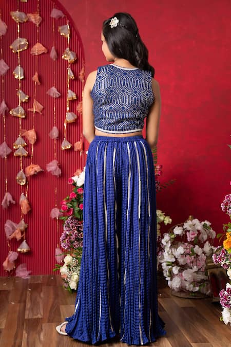 Blue crop top featuring sequin embroidery in a geometric pattern. Paired with an embroidered sharara and potli bag.