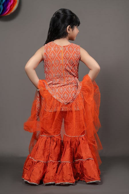 Dust orange kurta featuring floral embroidered motifs and a round neckline. Paired with a sharara and frill dupatta for a complete look.