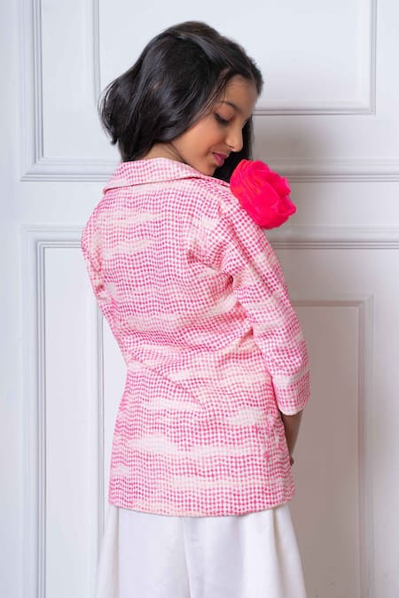 White blazer featuring pink thread embroidery and a 3D flower on one shoulder, complemented by a flared palazzo. The set is designed for kids and is made from silk and organza with a soft cotton lining.