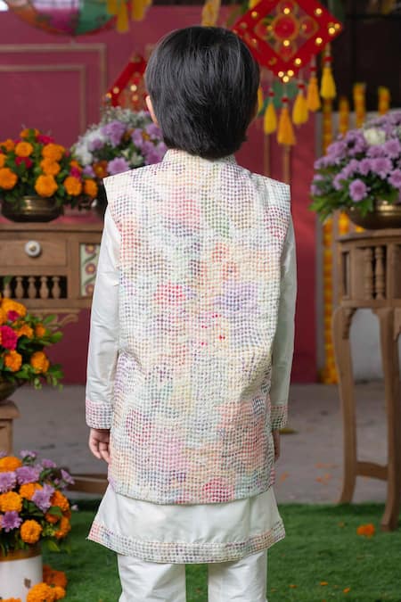 Multicolor bundi featuring thread embroidered jaal patterns and welt pockets. Paired with an inner kurta and straight pant.