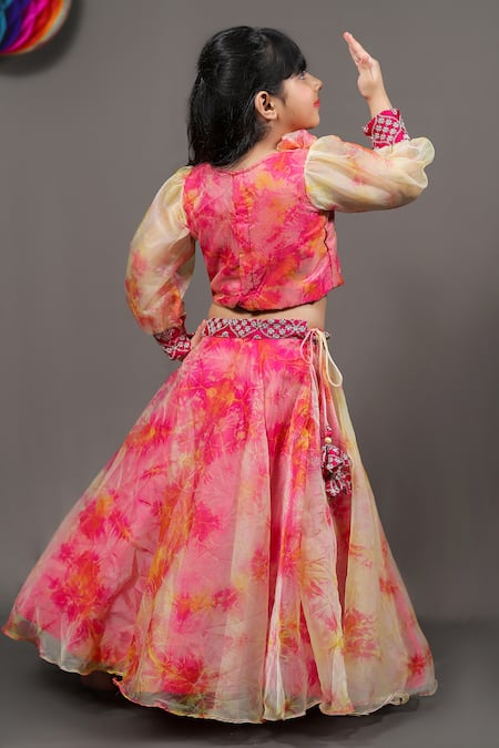 Pink lehenga featuring tie & dye detail and side tassel accents. Paired with a matching tie & dye top with puff sleeves and embroidered cuffs.