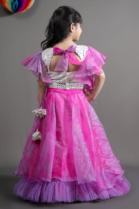 White and pink embellished lehenga featuring a layered design with tie-dye details. Paired with a mirror work top adorned with ruffle sleeves and a back tie-up.