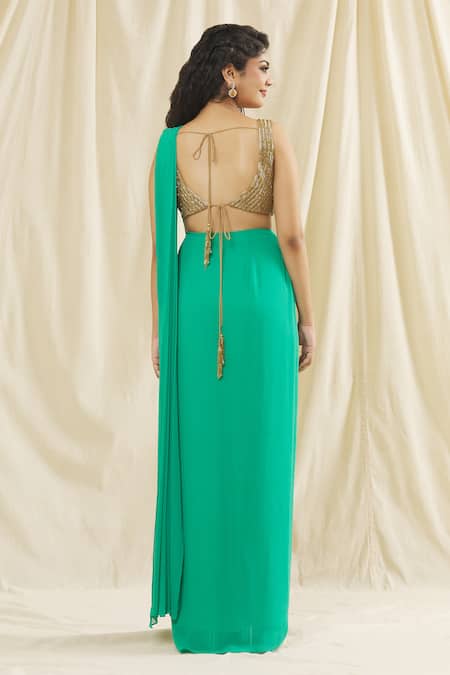 Gold georgette padded blouse featuring intricate beaded hand embroidery and a square neckline. Paired with a green draped skirt, designed for a relaxed fit.