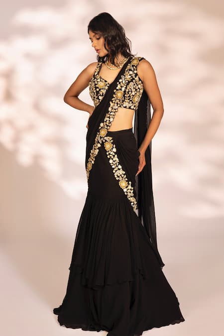 Black pre-draped saree featuring floral zardozi, sequin, and cutdana embroidery. Paired with a sweetheart neck padded blouse.