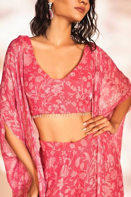 Pink cape featuring floral print and crystal embellished drops on the border. Paired with a printed padded blouse and flared pant.