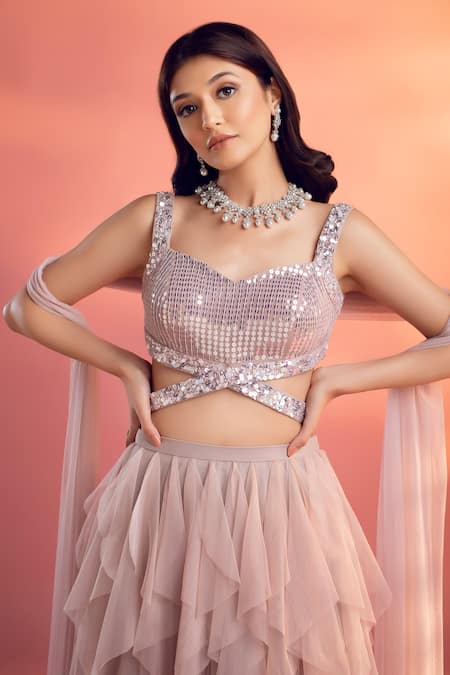 Grey-pink lehenga featuring multi ruffles and a crisscross waistband. Paired with a sequined padded blouse and an embellished dupatta with crystal drops.