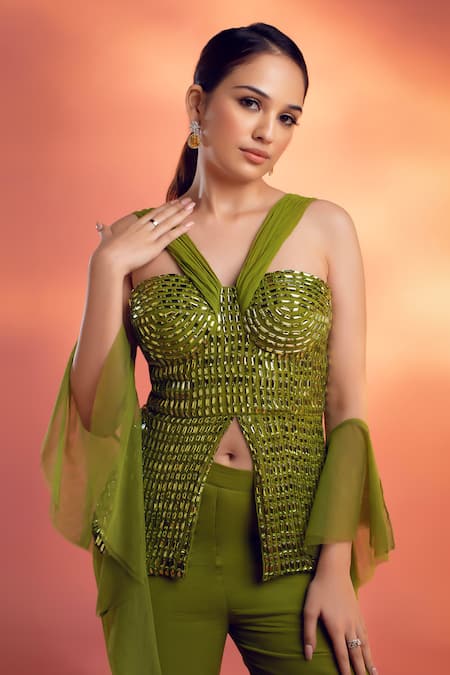 Green Net, Georgette Crystals Sweetheart Neck Thea Embellished Top Sharara Set