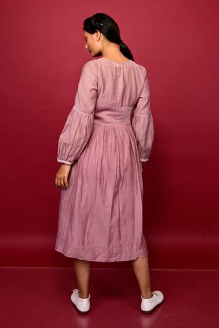 Pink midi dress featuring flower applique embroidery on the waistline with lace details on the neckline and sleeves. Comes with a pure cotton inner slip dress.