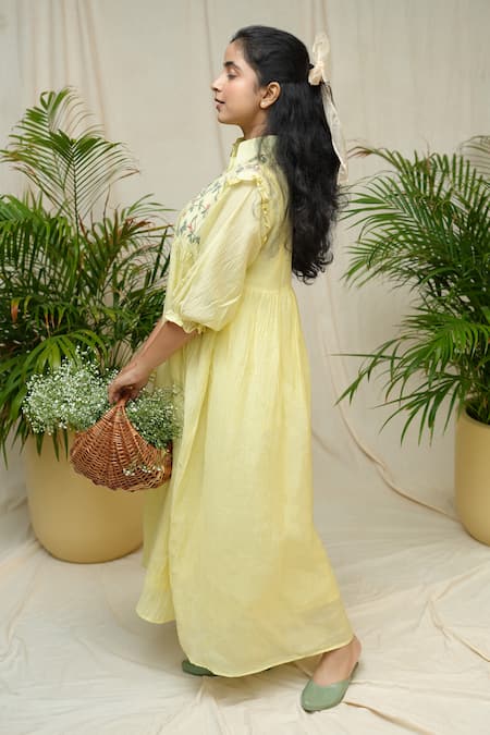 Buy_KKANYAAH_Yellow Silk, , Handloom Embroidery Collared Daffodil Delight Dress _Online_at_Aza_Fashions