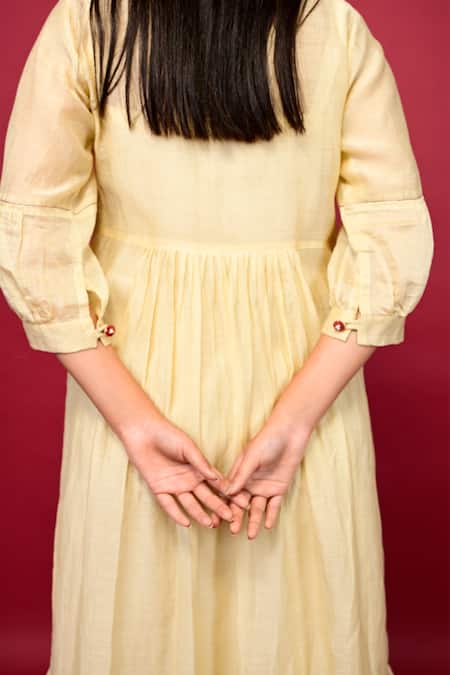 Buy_KKANYAAH_Ivory Silk, Cotton Embroidery Round Neck Floral Bodice Gathered Dress _at_Aza_Fashions