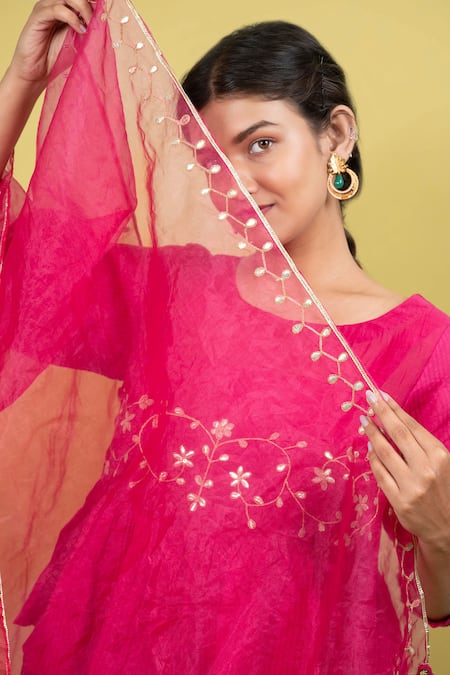 Pink tunic featuring floral hand embroidery with sequin detailing on the sleeve hem. Paired with a solid gathered skirt and a matching organza dupatta.