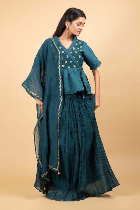 Peacock green wrap tunic featuring floral hand embroidery. Paired with a solid gathered skirt and a dupatta.