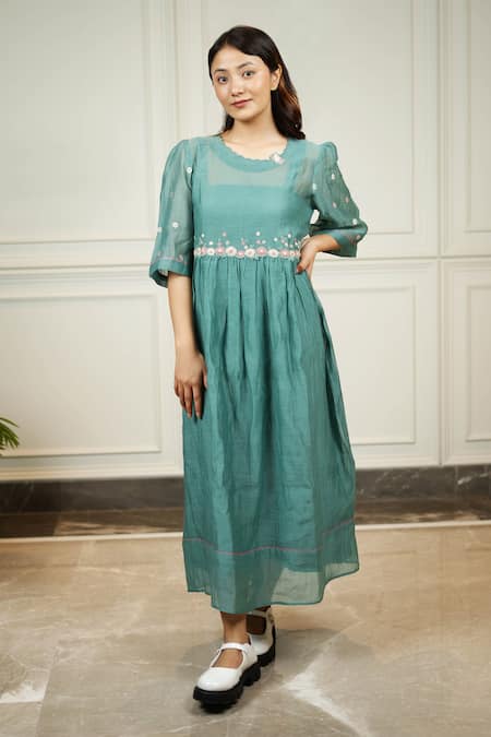 Green dress featuring a scallop round neckline and elbow sleeves with hand embroidery. Comes with a separate inner slip for added comfort.