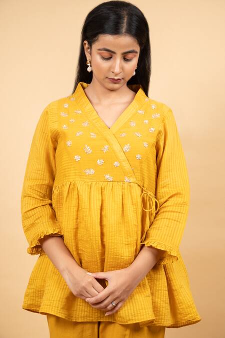 Mustard tunic featuring floral and sequin hand embroidery on the front yoke with a stripe pattern all over. Paired with coordinating organic cotton pants and a pure cotton inner slip.