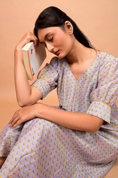 Grey floral print dress featuring a V neck and short puff sleeves. Paired with a pure cotton inner slip for added comfort.