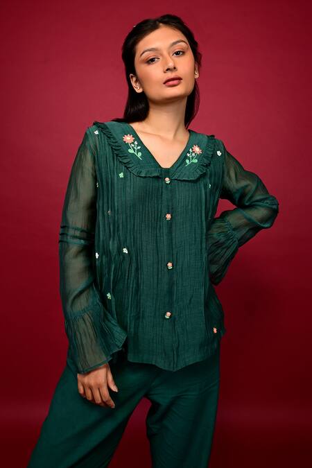 Bottle green shirt featuring a vintage collar and floral hand embroidery. Paired with organic cotton pants and a cotton slip.
