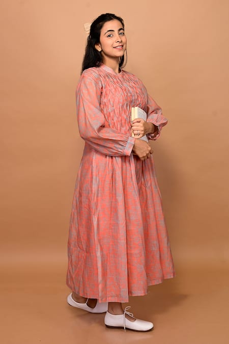 Orange Handloom Cotton, Silk Bandeau Neck Rose Print Smocked Dress