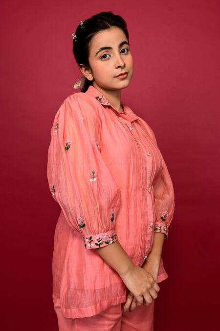 Peach silk shirt featuring threadwork floral motifs and a pleated bodice. Paired with scalloped hem pants made from organic cotton.