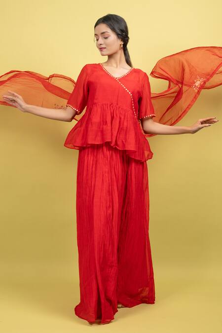 Red Silk, Handloom Cotton, Organza Embroidery Solid Gathered Skit Tunic Set