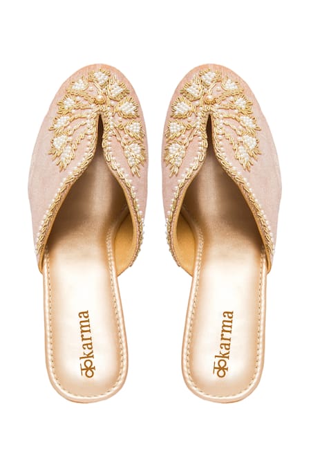 Pink mule block heels featuring gold zardozi and white beads embroidery