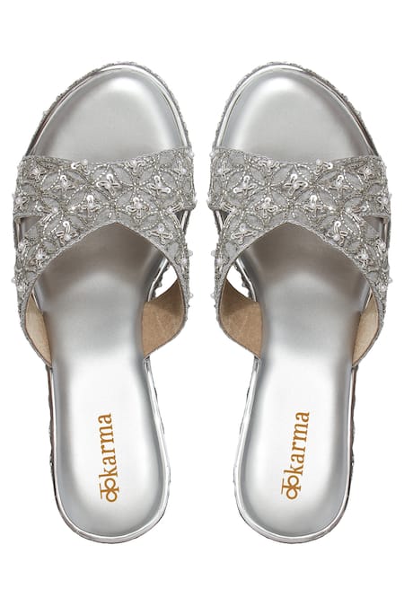 Grey and silver platform wedges featuring cutdana and sequin embroidery with a side cutout and open toe design