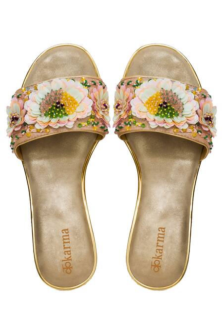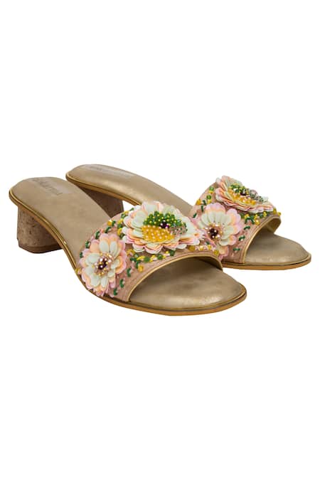 Sequin & cutdana work on floral motifs, Circular block heels for comfort