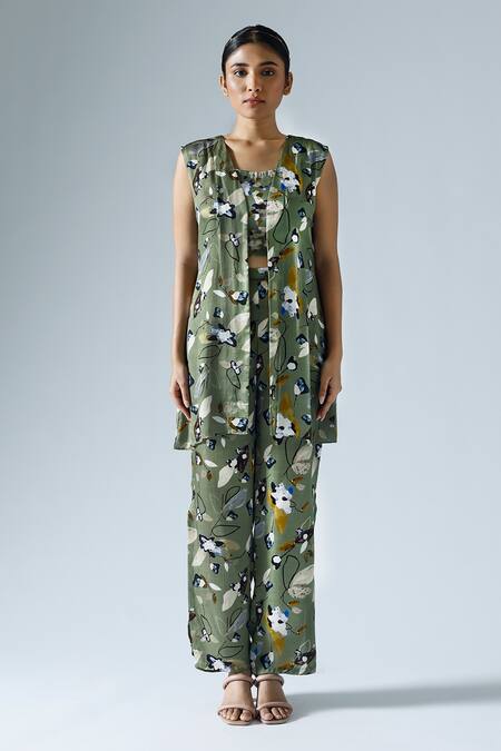 Green jacket featuring all-over abstract floral prints, designed with a front open style. Paired with coordinating slitted midrise pant and cotton inner slip.