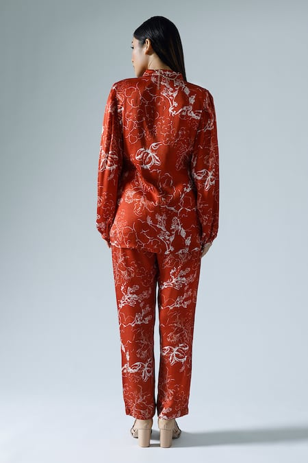 Red satin shirt featuring balloon sleeves and a collar, adorned with abstract floral prints. Paired with coordinating pocketed midrise pants with back elastic and zip fly fastening.