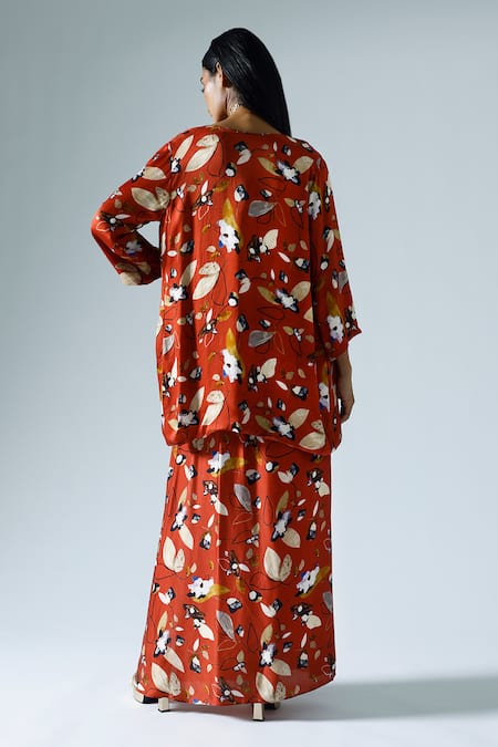 Red Satin Printed Abstract Floral Round Jacket And Skirt Set