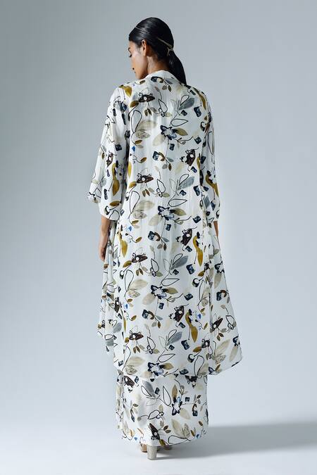 White jacket featuring an all-over abstract floral print with three-quarter sleeves. Paired with a coordinating slitted skirt and sleeveless inner slip.