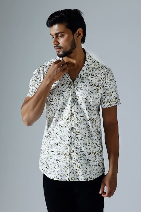 White shirt featuring a camp collar and half sleeves with an abstract smear print