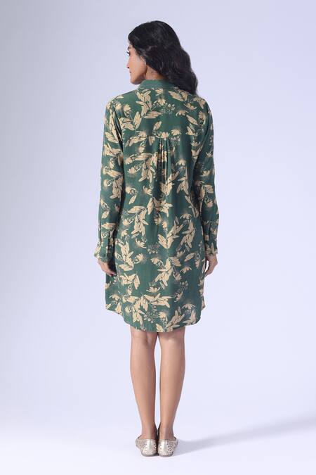 Green shirt dress featuring beetle print, full sleeves, and front button closure