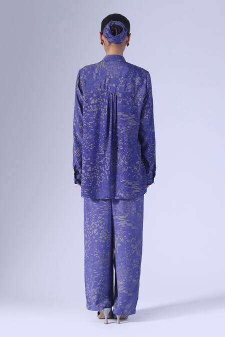 Buy_Klad_Blue Crepe Collared Botanic Print Coordinated Set_at_Aza_Fashions