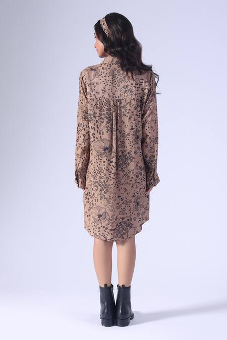 Buy_Klad_Brown Crepe Collared Botanic Print Shirt Dress_at_Aza_Fashions