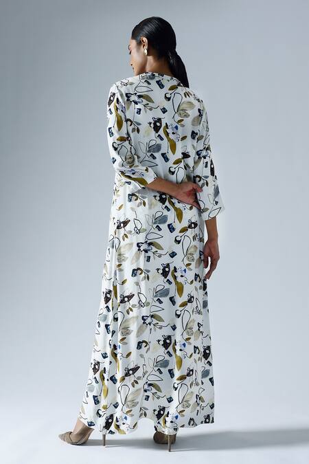 Front concealed button placket, All-over contrasted abstract floral prints, Coordinating midrise pant
