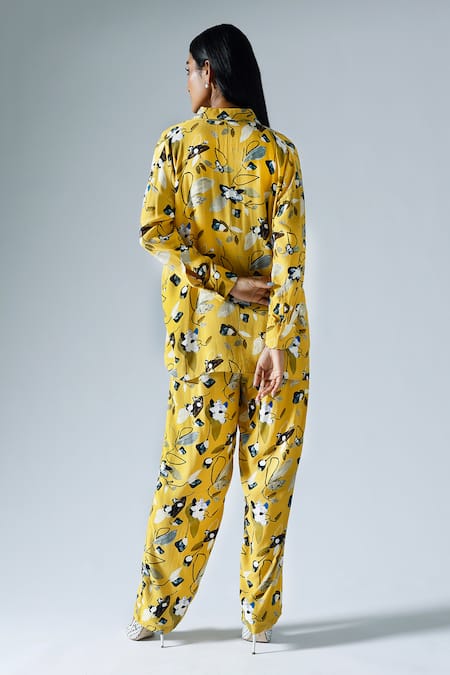 Yellow shirt featuring abstract floral print, collar neckline, and long cuffed sleeves. Paired with coordinating midrise pant with zip fly fastening.
