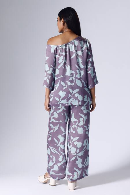 Purple Satin Printed Foliage Floral Asymmetric Top And Pant Set
