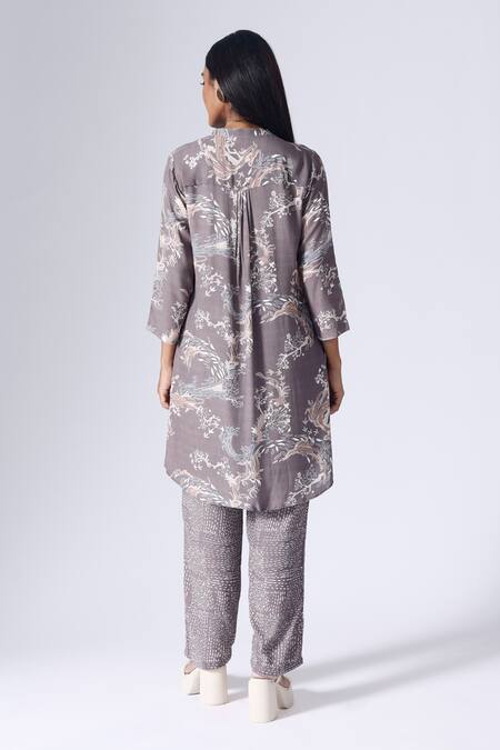 Purple kurta featuring a V neckline, three-quarter sleeves, and lotus print. Paired with matching pants with zip fly and single hook closure.