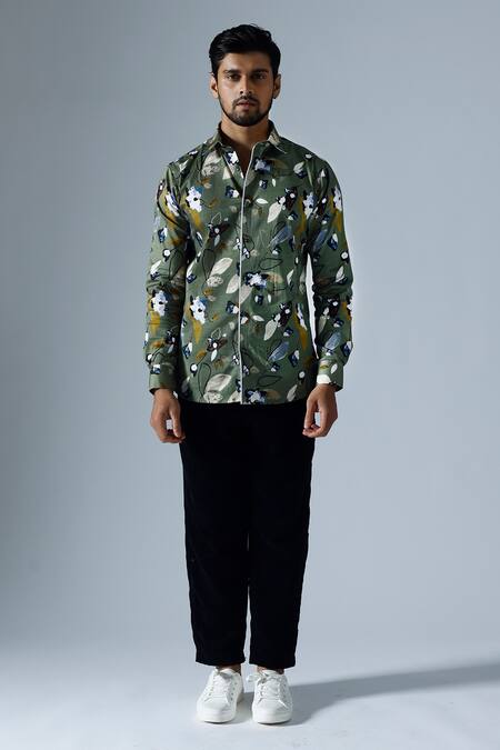 Green shirt featuring full sleeves, camp collar, and all-over mish mash flora print