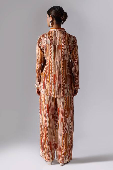 Buy_Klad_Brown Satin Collared Abstract Print Shirt_at_Aza_Fashions