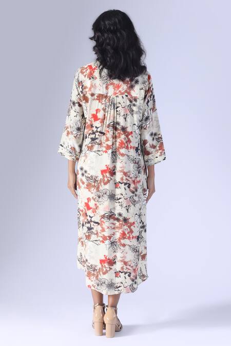Beige Crepe Collared Printed Long Dress With Belt