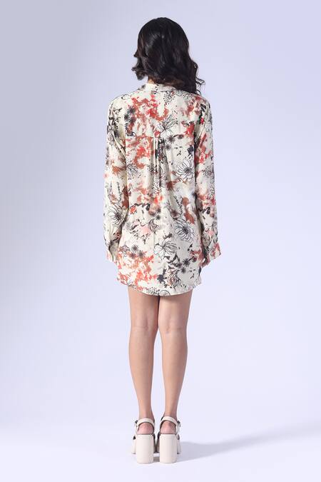 Beige floral printed shirt featuring full sleeves, front buttons, and back pleats. Paired with matching shorts that have pockets and back elastic with a zip fly fastening.