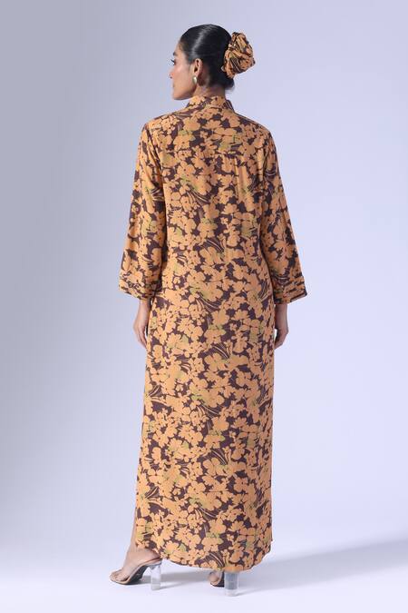 Brown printed long dress featuring three-fourth pleated sleeves and a front open design with buttons. Includes pockets, with a dress length of 52 inches and a side slit of 10 inches.