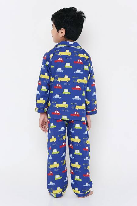 Blue cotton night suit featuring a car print design with a button front shirt and coordinating pants. The shirt includes a notch collar and a patch pocket, while the pants feature an elasticated waistband.