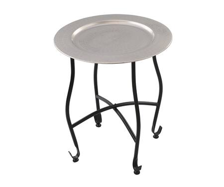 Silver brass finish table with etched & floral design tray top with folding leg stand.
