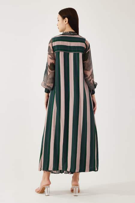 Peach and olive cape featuring a barcode stripe pattern and an open neckline